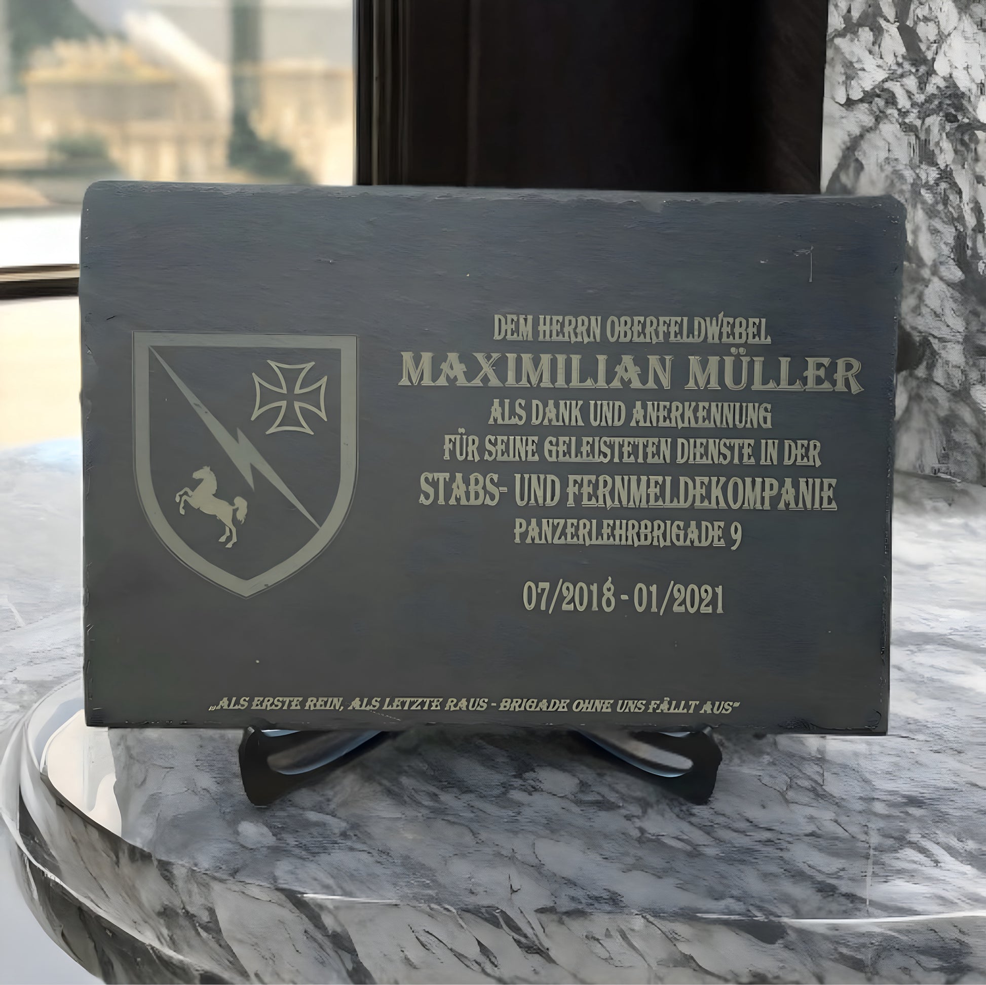 Überrasche Kameradinnen und Kameraden mit einem einzigartigen und hochwertigen Geschenk! Unsere personalisierten Schieferplatten sind die perfekte Wahl als Abschiedsgeschenk, Ehrung oder Auszeichnung.